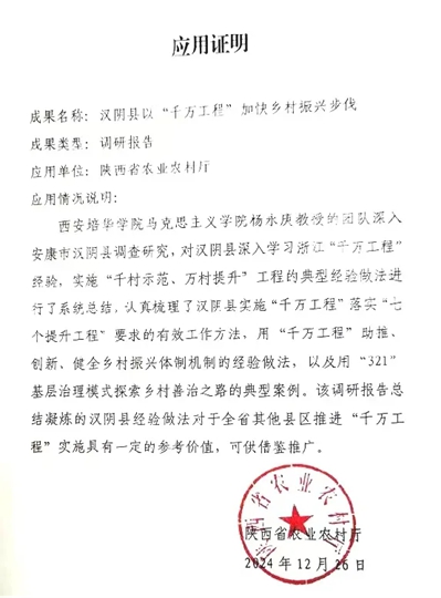 据悉,杨永庚教授是西安培华学院乡村振兴研究院乡村文化与基层社会治理研究中心负责人,致力于区域经济发展研究。此次调研成果能被省级相关部门应用,也得益于学校对乡村振兴工作的高度重视。学校于2021年7月成立乡村振兴研究院,旨在响应国家战略,链接校地资源,深化校地合作,助力乡村全面振兴,推进陕西省县域经济高质量发展。