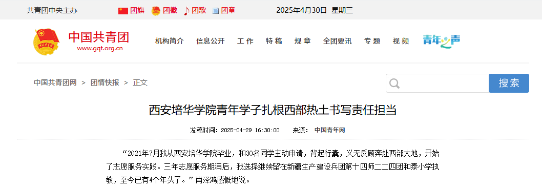 筑梦西部,唱响青春之歌;扎根基层,绘就奋斗底色。西安培华学院的青年学子们,正用他们的实际行动,在祖国最需要的地方,谱写着一曲曲动人的青春奉献之歌。他们向下扎根,从基层汲取养分与力量;向上生长,在广阔天地中追逐梦想、实现价值。他们的故事,激励着更多青年投身基层,为国家发展贡献青春力量,共同书写更加辉煌的明天。