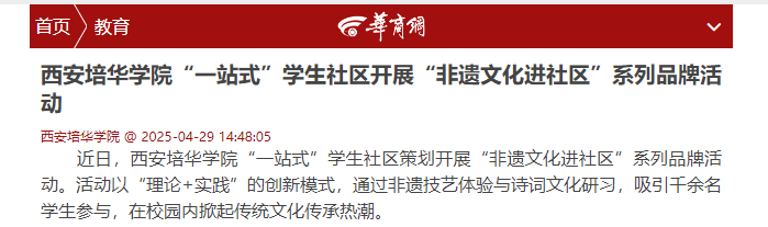近日,西安培华学院“一站式”学生社区策划开展“非遗文化进社区”系列品牌活动。活动以“理论+实践”的创新模式,通过非遗技艺体验与诗词文化研习,吸引千余名学生参与,在校园内掀起传统文化传承热潮。