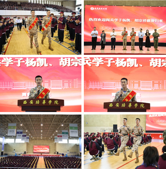 初秋的培华校园丹桂飘香、阵阵秋雨送来丝丝凉爽。9月11日清晨,西安培华学院校园内电子屏“热烈欢迎杨凯、胡宗祥参加九三阅兵凯旋归来”格外耀眼。刚刚参加完“九三阅兵”的2022届校友杨凯、2024届校友胡宗祥身着笔挺戎装返回母校,与师长和学弟学妹分享成长经历。