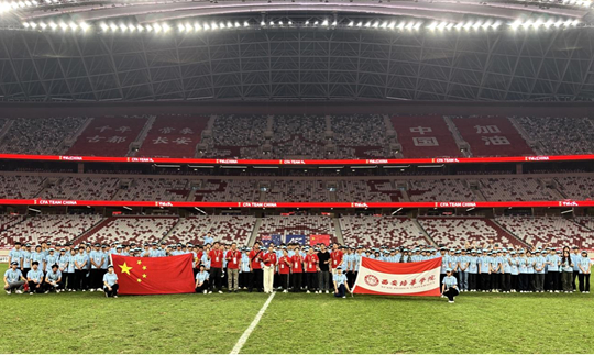 由培华志愿者精心布置的“红色海洋”成为赛场又一亮点。赛前,志愿者们分组将红色助威服整齐摆放在6万座席上;比赛间隙,引导观众穿戴助威服,带动全场形成红色视觉矩阵,与赛场内的国旗和加油标语相呼应,成为央视转播画面中的经典场景。