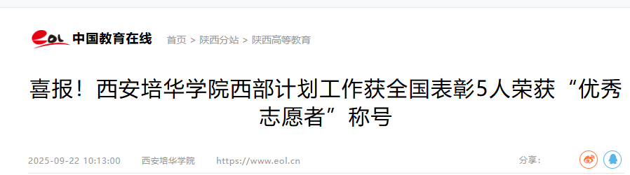 “到西部去,到基层去,到祖国最需要的地方去!”这句铿锵有力的誓言,始终激励着一批又一批培华青年奔赴远方、扎根热土、践行使命。近日,从全国大学生志愿服务西部计划项目管理办公室传来喜讯:西安培华学院5名毕业生荣获“全国大学生志愿服务西部计划考核优秀等次志愿者”称号,学校也获评“优秀等次项目办”。