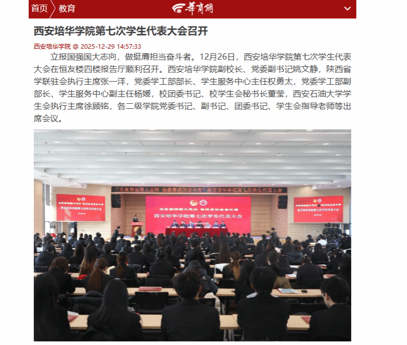 立报国强国大志向,做挺膺担当奋斗者。12月26日,西安培华学院第七次学生代表大会在恒友楼四楼报告厅顺利召开。西安培华学院副校长、党委副书记姚文静,陕西省学联驻会执行主席张一洋,党委学工部部长、学生服务中心主任权勇太,党委学工部副部长、学生服务中心副主任杨媛,校团委书记、校学生会秘书长董莹,西安石油大学学生会执行主席徐顾铭,各二级学院党委书记、副书记、团委书记、学生会指导老师等出席会议。