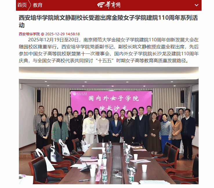 2025年12月19至20日,南京师范大学金陵女子学院建院110周年创新发展大会在随园校区举行。西安培华学院党委副书记、副校长姚文静教授应邀全程出席,先后参加中国女子高等院校联盟第十一次理事会、国内外女子学院院长沙龙及建院110周年庆典,与全国女子高校代表共话“十五五”时期女子高等教育高质量发展路径。