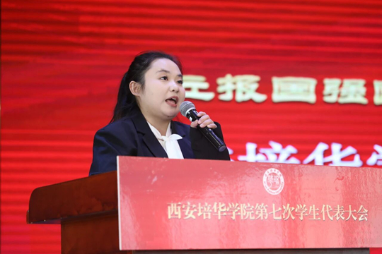 刘蕊同学代表西安培华学院第六届学生会主席团全面汇报了过去一年学生会在思想政治引领、服务同学成长、繁荣校园文化、深化组织改革等方面的工作实绩。并表示学生会要学思践悟习近平总书记关于青年工作的重要思想,践行服务宗旨,深化改革创新,勇担时代使命,定将恪守“校誉至上、质量第一、自强不息、开拓前进”的校训精神,团结引领培华青年凝心聚力共奋进,凝聚广大青年为建设中国式现代化贡献青春力量。