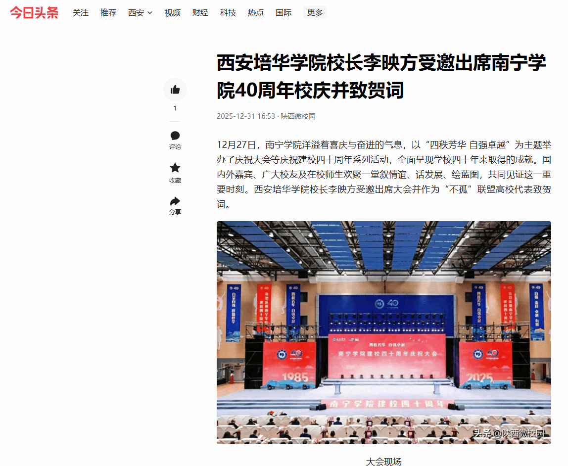 12月27日,南宁学院洋溢着喜庆与奋进的气息,以“四秩芳华 自强卓越”为主题举办了庆祝大会等庆祝建校四十周年系列活动,全面呈现学校四十年来取得的成就。国内外嘉宾、广大校友及在校师生欢聚一堂叙情谊、话发展、绘蓝图,共同见证这一重要时刻。西安培华学院校长李映方受邀出席大会并作为“不孤”联盟高校代表致贺词。