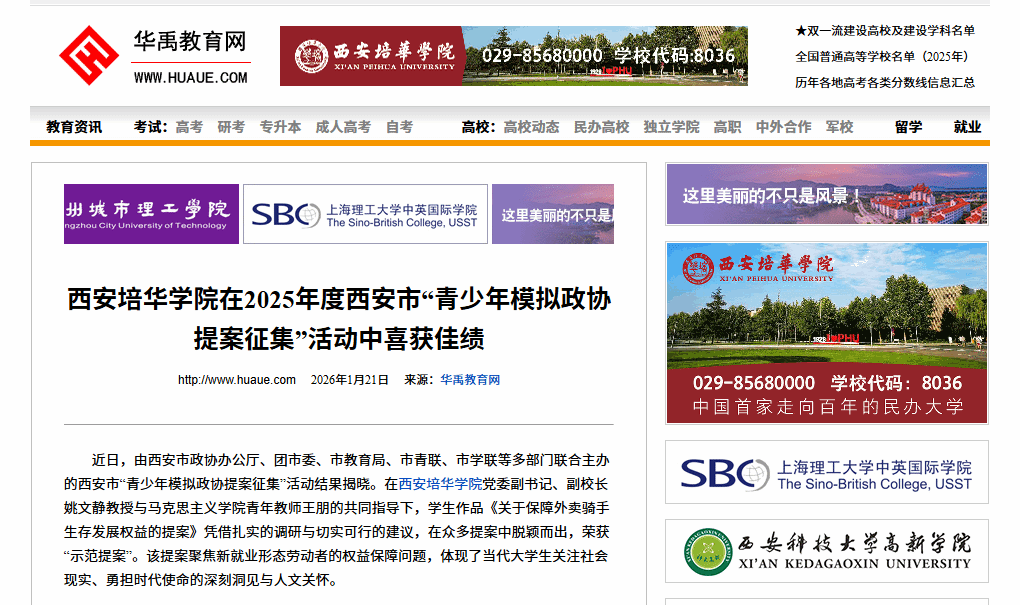 近日,由西安市政协办公厅、团市委、市教育局、市青联、市学联等多部门联合主办的西安市“青少年模拟政协提案征集”活动结果揭晓。在西安培华学院党委副书记、副校长姚文静教授与马克思主义学院青年教师王朋的共同指导下,学生作品《关于保障外卖骑手生存发展权益的提案》凭借扎实的调研与切实可行的建议,在众多提案中脱颖而出,荣获“示范提案”。该提案聚焦新就业形态劳动者的权益保障问题,体现了当代大学生关注社会现实、勇担时代使命的深刻洞见与人文关怀。