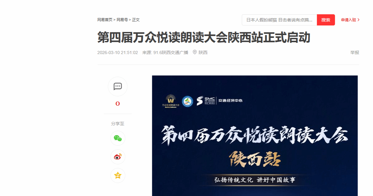 第四届万众悦读朗读大会陕西站的启动,标志着新一届赛事正式拉开帷幕。即日起,全省朗读爱好者可通过官方渠道报名参与,在声音的舞台上绽放光彩,用语言讴歌伟大时代。