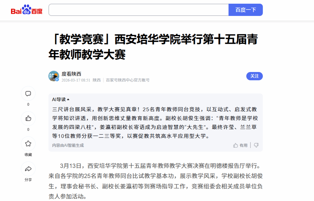 3月13日,西安培华学院第十五届青年教师教学大赛决赛在明德楼报告厅举行。来自各学院的25名青年教师同台比试教学基本功,展示教学风采,学校副校长胡俊生,理事会秘书长、副校长姜瀛初等到赛场指导工作,竞赛组委会相关成员单位负责人参加活动。