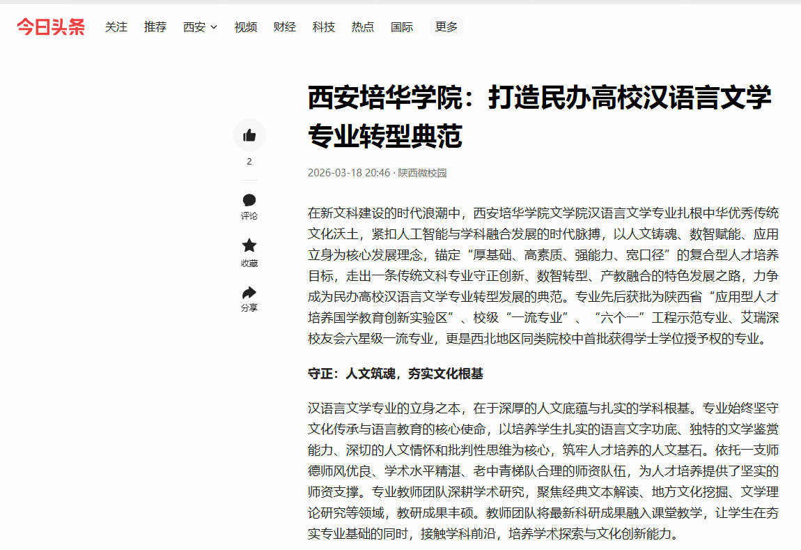 在新文科建设的时代浪潮中,西安培华学院文学院汉语言文学专业扎根中华优秀传统文化沃土,紧扣人工智能与学科融合发展的时代脉搏,以人文铸魂、数智赋能、应用立身为核心发展理念,锚定“厚基础、高素质、强能力、宽口径”的复合型人才培养目标,走出一条传统文科专业守正创新、数智转型、产教融合的特色发展之路,力争成为民办高校汉语言文学专业转型发展的典范。专业先后获批为陕西省“应用型人才培养国学教育创新实验区”、校级“一流专业”、“六个一”工程示范专业、艾瑞深校友会六星级一流专业,更是西北地区同类院校中首批获得学士学位授予权的专业。