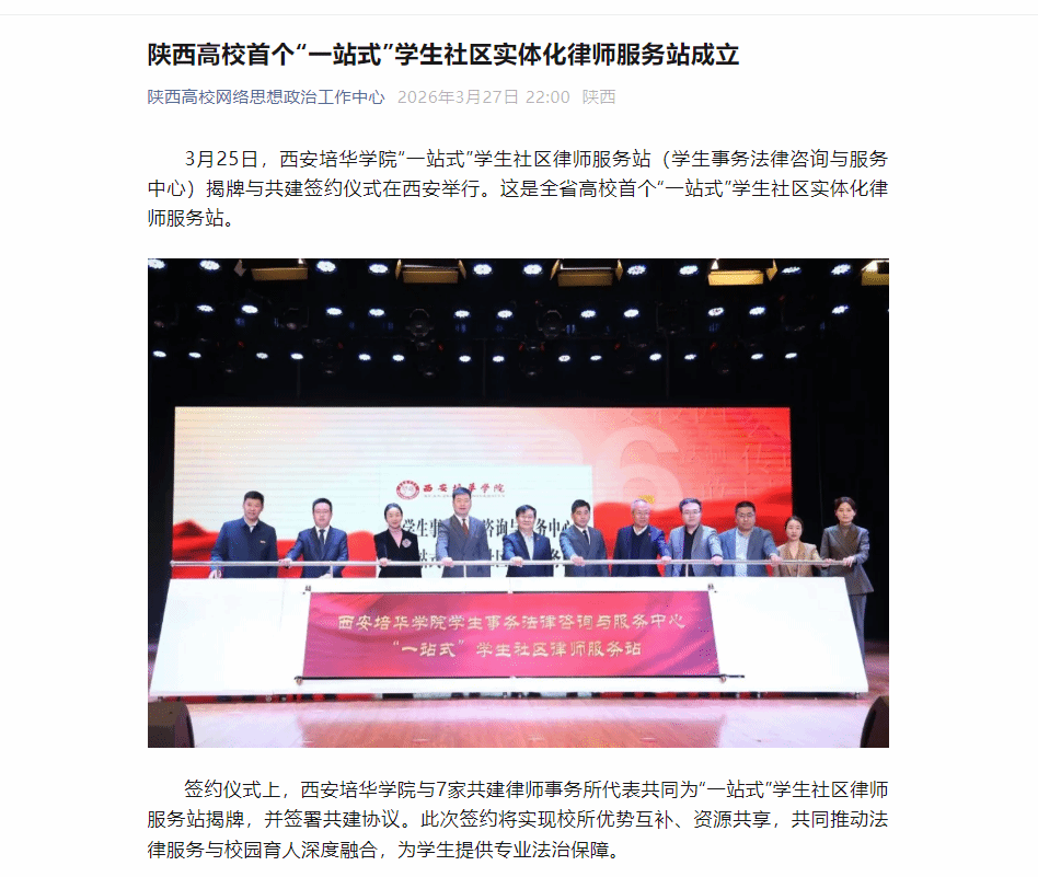 3月25日,西安培华学院“一站式”学生社区律师服务站(学生事务法律咨询与服务中心)揭牌与共建签约仪式在西安举行。这是全省高校首个“一站式”学生社区实体化律师服务站。