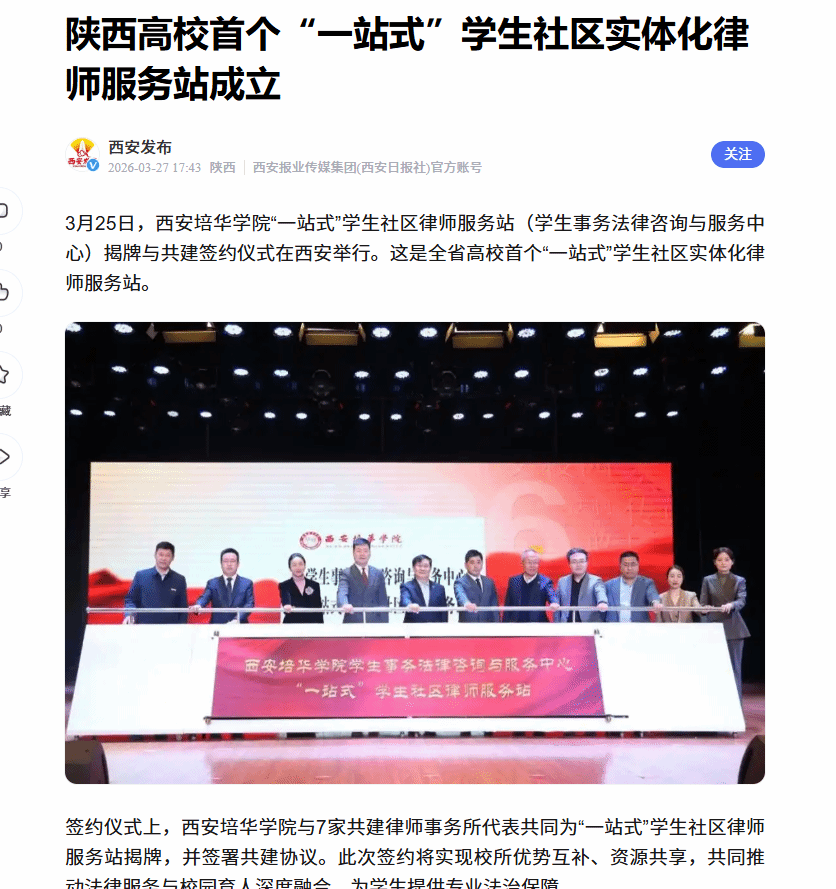 3月25日,西安培华学院“一站式”学生社区律师服务站(学生事务法律咨询与服务中心)揭牌与共建签约仪式在西安举行。这是全省高校首个“一站式”学生社区实体化律师服务站。