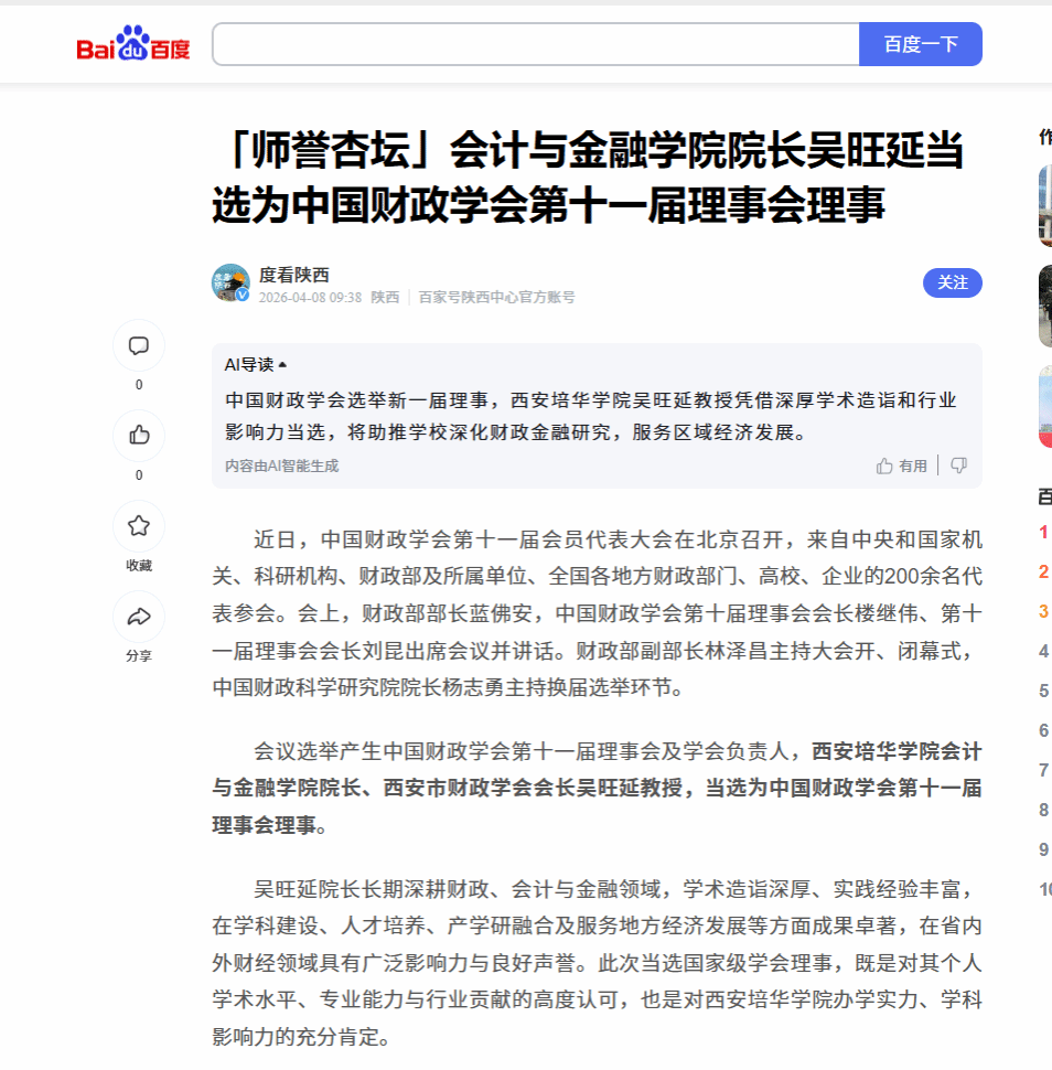 吴旺延院长长期深耕财政、会计与金融领域,学术造诣深厚、实践经验丰富,在学科建设、人才培养、产学研融合及服务地方经济发展等方面成果卓著,在省内外财经领域具有广泛影响力与良好声誉。此次当选国家级学会理事,既是对其个人学术水平、专业能力与行业贡献的高度认可,也是对西安培华学院办学实力、学科影响力的充分肯定。
