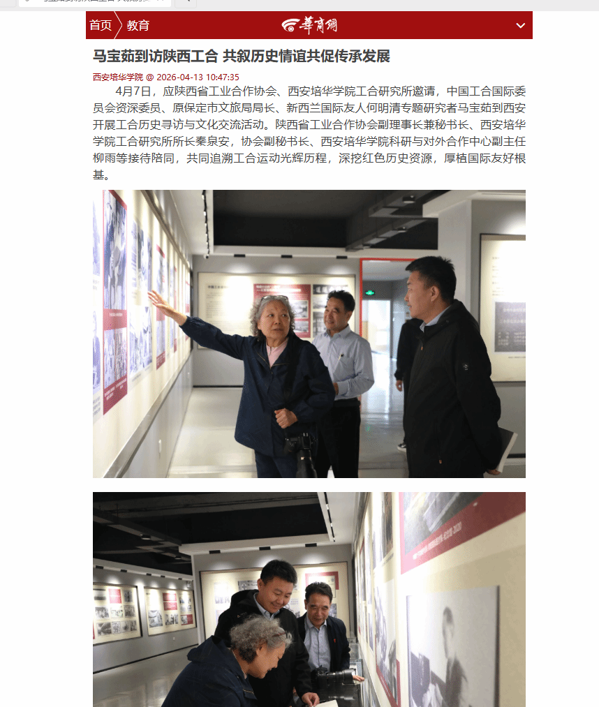 4月7日,应陕西省工业合作协会、西安培华学院工合研究所邀请,中国工合国际委员会资深委员、原保定市文旅局局长、新西兰国际友人何明清专题研究者马宝茹到西安开展工合历史寻访与文化交流活动。陕西省工业合作协会副理事长兼秘书长、西安培华学院工合研究所所长秦泉安,协会副秘书长、西安培华学院科研与对外合作中心副主任柳雨等接待陪同,共同追溯工合运动光辉历程,深挖红色历史资源,厚植国际友好根基。