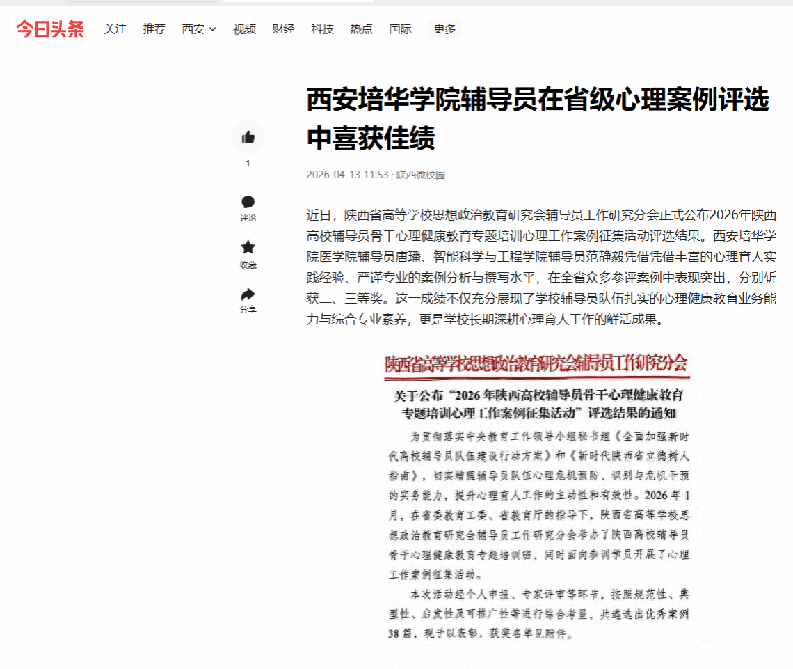 近日,陕西省高等学校思想政治教育研究会辅导员工作研究分会正式公布2026年陕西高校辅导员骨干心理健康教育专题培训心理工作案例征集活动评选结果。西安培华学院医学院辅导员唐璠、智能科学与工程学院辅导员范静毅凭借凭借丰富的心理育人实践经验、严谨专业的案例分析与撰写水平,在全省众多参评案例中表现突出,分别斩获二、三等奖。这一成绩不仅充分展现了学校辅导员队伍扎实的心理健康教育业务能力与综合专业素养,更是学校长期深耕心理育人工作的鲜活成果。