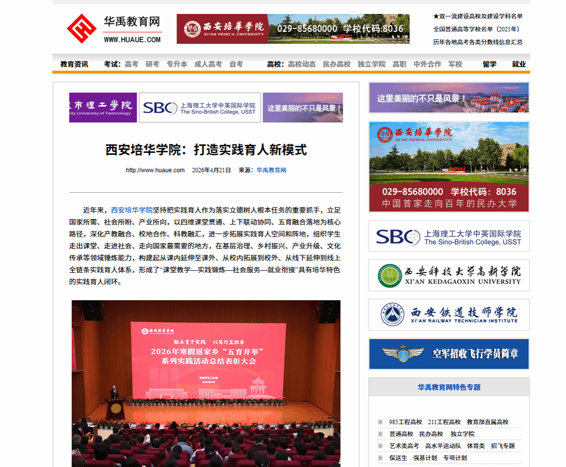 近年来,西安培华学院坚持把实践育人作为落实立德树人根本任务的重要抓手,立足国家所需、社会所盼、产业所向,以四维课堂贯通、上下联动协同、五育融合落地为核心路径,深化产教融合、校地合作、科教融汇,进一步拓展实践育人空间和阵地,组织学生走出课堂、走进社会、走向国家最需要的地方,在基层治理、乡村振兴、产业升级、文化传承等领域锤炼能力,构建起从课内延伸至课外、从校内拓展到校外、从线下延伸到线上全链条实践育人体系,形成了“课堂教学—实践锻炼—社会服务—就业衔接”具有培华特色的实践育人闭环。