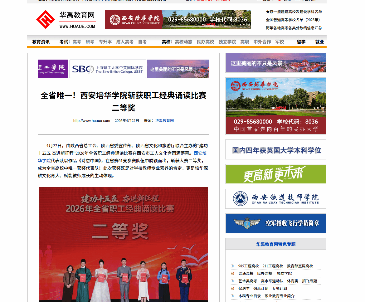 4月22日,由陕西省总工会、陕西省委宣传部、陕西省文化和旅游厅联合主办的“建功十五五 奋进新征程”2026年全省职工经典诵读比赛在西安市工人文化宫圆满落幕。西安培华学院代表队以作品《诗意中国》,在省赛61支参赛队伍中脱颖而出,斩获大赛二等奖,成为全省高校中唯一获奖代表队!此次获奖既是对学校教师专业素养的肯定,更是培华深耕文化育人、赋能教师成长的生动体现。