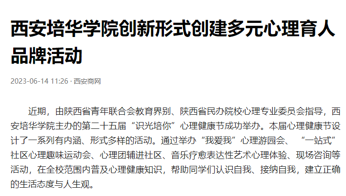 该校学生潜能发展中心主任韩赟表示,心理健康教育作为落实立德树人根本任务的重要抓手,西安培华学院坚持将育心和育人相结合,以生涯规划为引领,促进学生心理健康,助力大学生身心健康发展为目标,进一步提升大学生心理健康工作的针对性和有效性,持续多样化、立体化、个性化探索心理育人新模式和新方法。