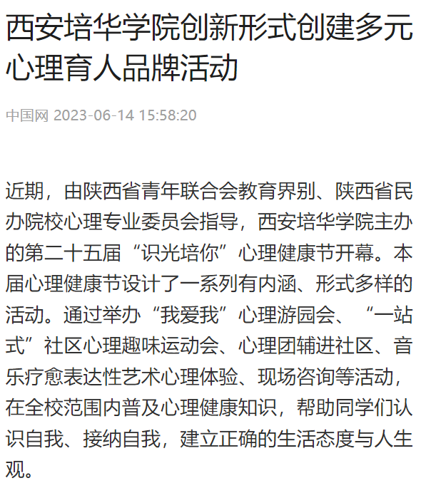该校学生潜能发展中心主任韩赟表示,心理健康教育作为落实立德树人根本任务的重要抓手,西安培华学院坚持将育心和育人相结合,以生涯规划为引领,促进学生心理健康,助力大学生身心健康发展为目标,进一步提升大学生心理健康工作的针对性和有效性,持续多样化、立体化、个性化探索心理育人新模式和新方法。