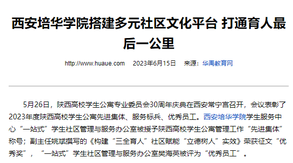 5月26日,陕西高校学生公寓专业委员会30周年庆典在西安常宁宫召开,会议表彰了2023年度陕西高校学生公寓先进集体、服务标兵、优秀员工。西安培华学院学生服务中心“一站式”学生社区管理与服务办公室被授予陕西高校学生公寓管理工作“先进集体”称号;副主任姚斌撰写的《构建“三全育人”社区赋能“立德树人”实效》荣获征文“优秀奖”,“一站式”学生社区管理与服务办公室樊海英被评为“优秀员工”。