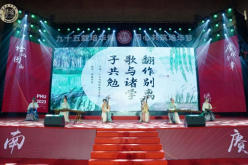 毕业典礼最后,由人文与国际教育学院和传媒学院教师带来的古乐吟诵节目《翻作别离歌与诸学子共勉》,在时空穿越中,用音乐彰显培华女性教育的魅力,感受中华传统文化的韵律,传递培风图南的祝福。