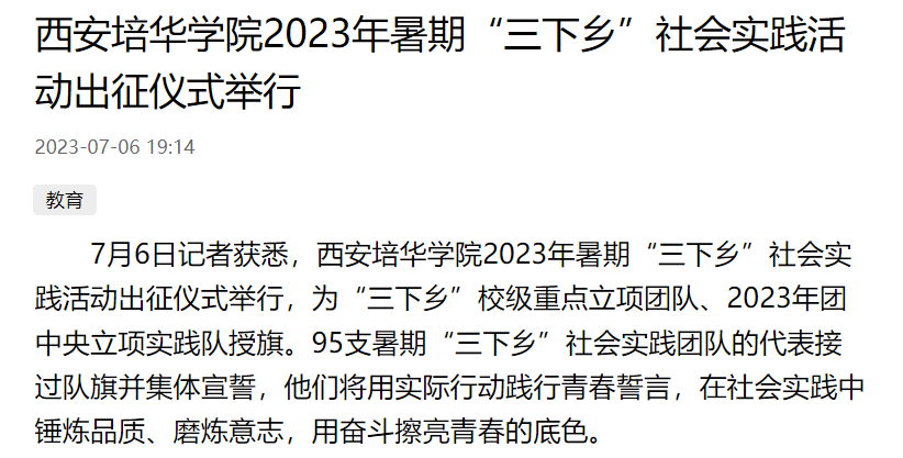 据悉,本次暑期“三下乡”社会实践活动组建了95支校级重点立项团队(含10项团中央立项团队),同时也蕴涵着培华青年向培华建校95周年的庄重献礼。重点组织学生围绕理论宣讲、党史学习教育、乡村振兴推进、发展成就观察、民族团结实践、绿色生态宣传、创新创业研学等方面,深入农村和基层一线,在亲身经历中,坚定理想信念、了解国情民情社情、练就过硬本领,把青春奉献在党和国家最需要的地方,努力在社会实践的舞台上谱写更新、更美的篇章。