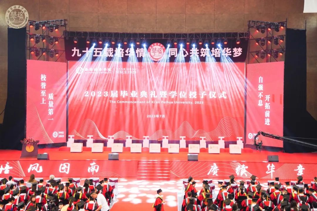 7月1日上午,西安培华学院2023届毕业典礼暨学士学位授予仪式在长安校区体育馆举行,全体校级领导、学位委员会委员、教师代表、辅导员代表、毕业生家长代表、校友代表以及2023届毕业生代表2000余人共同见证这一特殊而又神圣的毕业时刻。