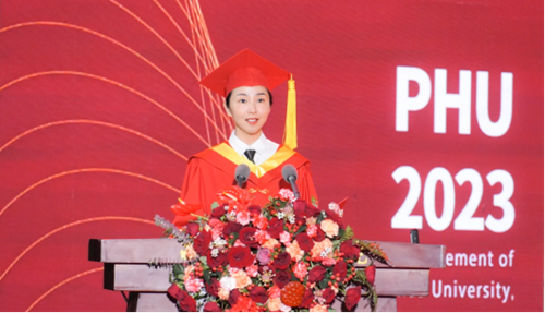 传媒学院新闻学专业2023届学生倪心玉作为毕业生代表发言,她感恩了学校、老师、家人及同学们的奉献与陪伴,她说:初遇培华,追逐梦想,为创建“姜维之班”与同学们共同努力,她的大学生活因此而更加精彩;在老师的引领下,夯实基础,追求卓越,在专业学习和实践中走向成熟,是敬爱的老师们成就了他们的优秀;在暑期三下乡、志愿服务抗击疫情等社会实践中更是学会了责任与担当。她动情地说:我将一生铭记波哥的守护与支持,带着期许从这里启程,奔赴远方的星城大海。最后她与在座的同学们一起用最真诚的掌声为母校送上深深地祝福!