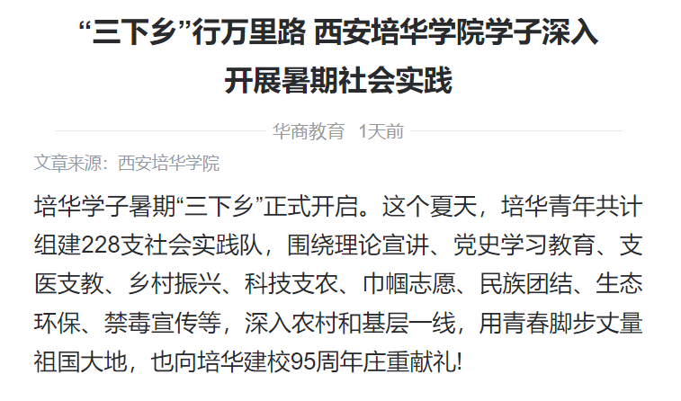 时代各有不同,青春一脉相承。暑期“三下乡”实践活动中,培华学子在亲身经历中,坚定理想信念,了解国情民情社情、练就过硬本领,把青春奉献在党和国家最需要的地方,在社会实践的舞台上谱写更新、更美的篇章!