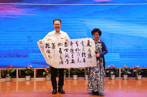 陕西广播电视台著名资深节目主持人、陕西省传统文化发展促进会会长陈爱美为西安培华学院颁发“副会长单位证书”,姜波理事长上台接受聘书