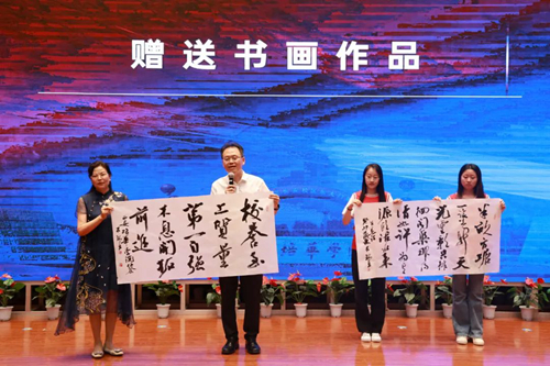 肖云儒、宋亚平、石瑞芳、吴福春(陈爱美代)、朱思明、张天德、杨勇依次上台向西安培华学院赠送墨宝作品,愿传承九五光辉,再铸培华辉煌