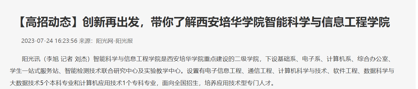 阳光讯(李旭 记者 刘杰)智能科学与信息工程学院是西安培华学院重点建设的二级学院,下设基础系、电子系、计算机系、综合办公室、学生一站式服务站、智能检测技术联合研究中心及实验教学中心。设置有电子信息工程、通信工程、计算机科学与技术、软件工程、数据科学与大数据技术5个本科专业和计算机应用技术1个专科专业,面向全国招生,培养应用技术型专门人才。