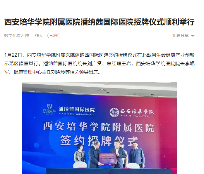 1月22日,西安培华学院附属医院潘纳茜国际医院签约授牌仪式在北戴河生命健康产业创新示范区隆重举行。潘纳茜国际医院院长刘广贤、总经理王岩,西安培华学院医院院长李旭军、健康管理中心主任刘晓玲等相关领导出席。