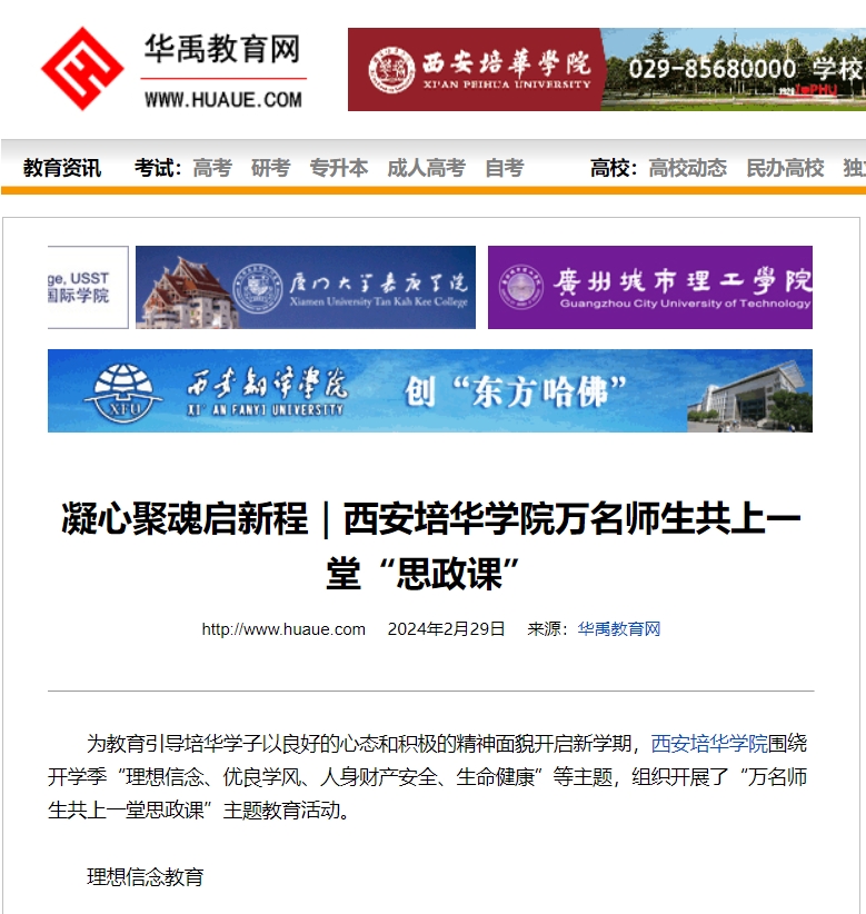 为教育引导培华学子以良好的心态和积极的精神面貌开启新学期,西安培华学院围绕开学季“理想信念、优良学风、人身财产安全、生命健康”等主题,组织开展了“万名师生共上一堂思政课”主题教育活动。