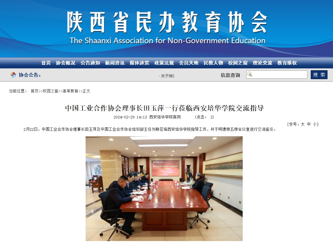 2月22日,中国工业合作协会理事长田玉萍及中国工业合作协会培训部主任刘敏莅临西安培华学院指导工作,并于明德楼五楼会议室进行交流座谈。