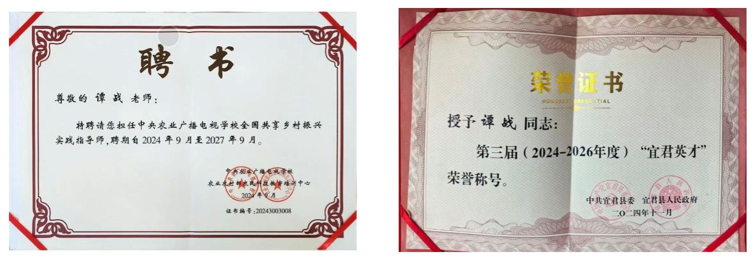 凭借在农业领域的卓越贡献,谭战成长为皇后村的“致富带头人”“点灯人”和“头雁”。他先后获评陕西省高素质农民培育省级名师,铜川市行业领域骨干人才,铜川市优秀青年,宜君县政协常务委员,宜君县职业农民协会副会长,高级农艺师,高级职业农民。
