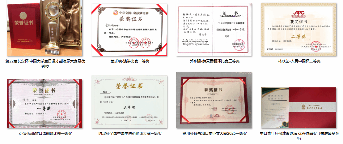 专业课程建设成果丰硕,《高级日语Ⅰ》获评院级应用型示范课程,《高级日语Ⅱ》《跨文化交际》获评院级金课,为高质量教学提供坚实支撑。坚持以赛促学、以赛促能,学生在国家级、省级、国际级赛事中屡创佳绩:斩获笹川杯品书知日本征文大赛国际一等奖、“外研社·国才杯”全国总决赛三等奖、人民中国杯日语翻译大赛二等奖、韩素音国际翻译大赛三等奖、陕西省大学生日语翻译竞赛一等奖等权威奖项,累计获得国家级奖项10余项、省级奖项10余项、国际级奖项1项,全面彰显专业人才培养质量。