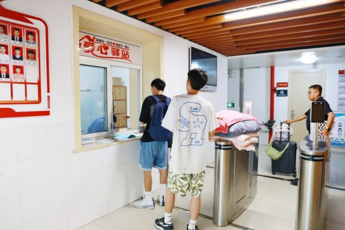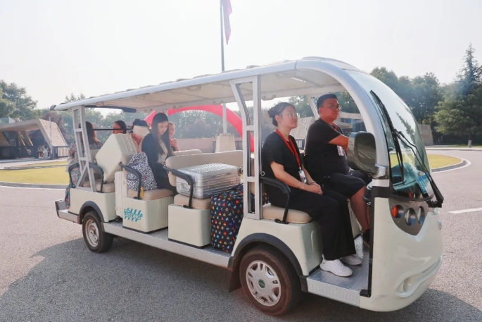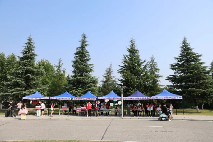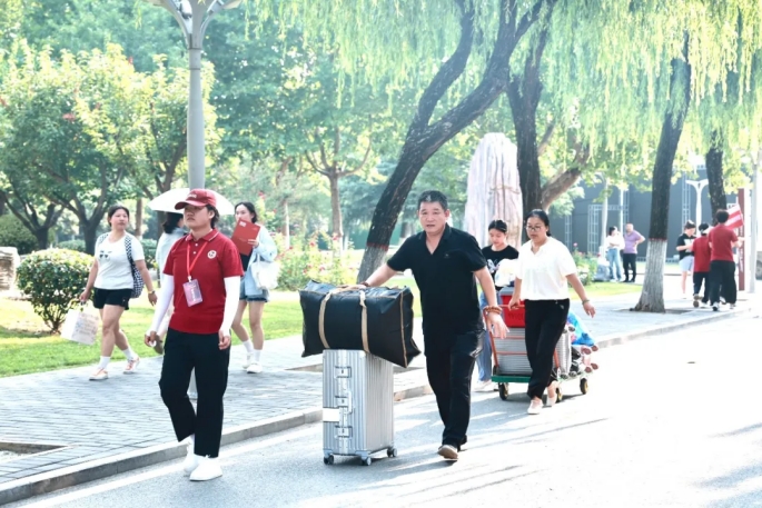 大批的志愿者,帮新生一起扛行李、提供咨询服务,陪同办理报到手续,还有摆渡车全天侯为学子提供服务。
