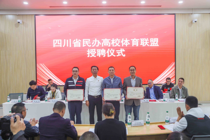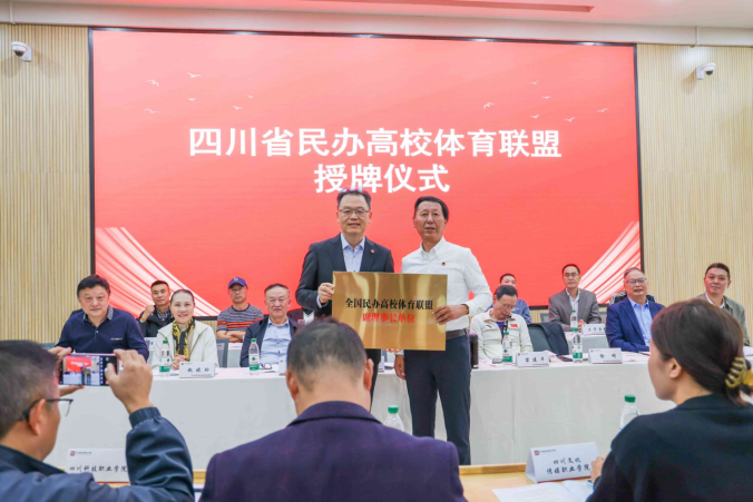 随后,大会迎来了激动人心的时刻。全国民办高校体育联盟理事长姜波宣布“四川省民办高校体育联盟”正式成立。姜波理事长向四川国际标榜职业学院授予了“全国民办高校体育联盟副理事长单位”和“四川民办高校体育联盟主席单位”的荣誉称号。