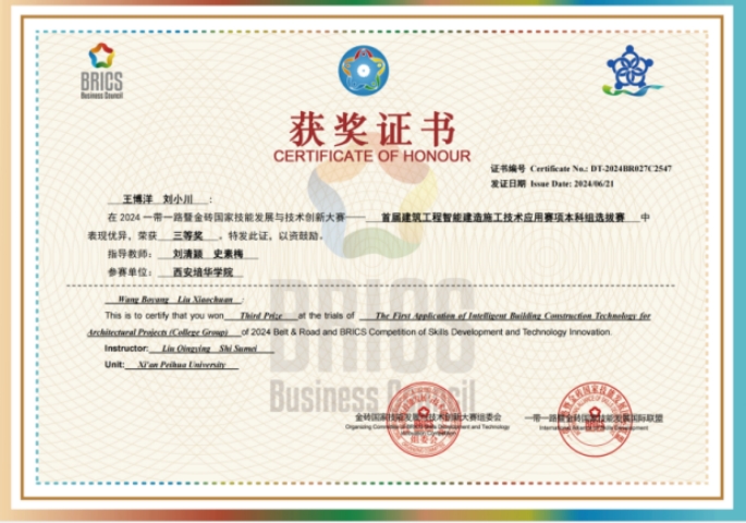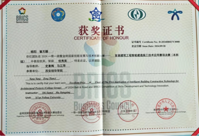 智能科学与工程学院在本次金砖大赛建筑赛项中贯彻落实习近平总书记关于“激励更多劳动者特别是青年一代走技能成才、技能报国之路”的重要指示,和金砖国家领导人关于加强金砖国家间技能、加强标准化领域交流与合作等有关精神,不仅高度聚焦党的二十大“推进工业、建筑、交通等领域清洁低碳转型”精神,对接国家“十四五”规划“发展智能建造、推广绿色建材、建设低碳城市”要求,而且积极响应绿色低碳创新型竞赛设计思路、数字化竞赛平台,大力推动土木工程专业学生进行施工类行业相关岗位的知识、技能、素养训练。最终我校土木工程专业学生王博洋、刘小川(指导老师刘清颖、史素梅)获得区域团体三等奖一项,土木工程专业学生杨阳、曾天赐(指导老师史素梅、马江萍)获得区域团体三等奖一项,土木工程专业学生杨阳、曾天赐(指导老师史素梅、马江萍)获得全国团体优秀奖1项。
