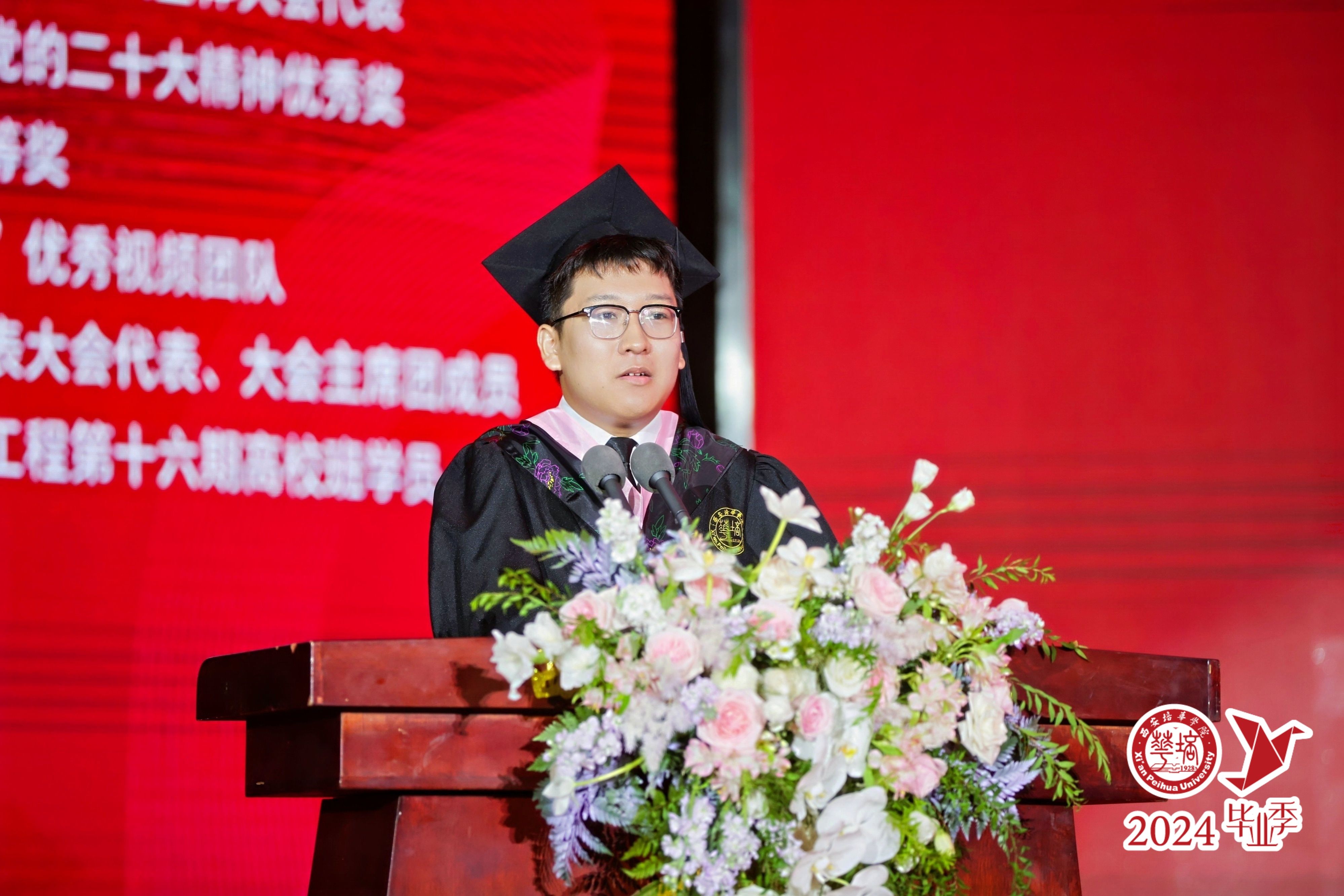 人文与国际教育学院员泽阳同学作为毕业生代表发言。他向学校、老师、家人的无私守护以及理事长的栽培表达了感谢,深情地回顾了在培华锤炼意志的青春岁月。他讲到,在培华的学习与历练,是孕育无限希望的青春加油站。细数大学的1460多个日日夜夜,一直在师友的帮助下脚踏实地的学习成长。他动情地说:毕业离校后将带着历久弥新的培华精神和不断突破的挺膺担当一路向前!