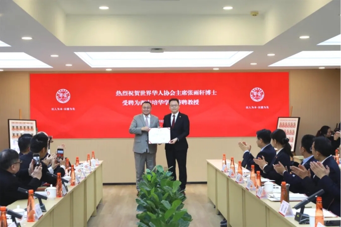 姜波理事长为世界华人协会主席张雨轩博士颁发聘书