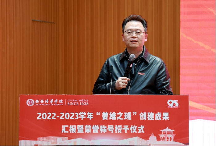 理事长姜波博士肯定了“姜维之班”历年来的创建成果和不菲成绩,同时对创建过程中付出辛勤努力的职能部门老师、辅导员老师、学业导师及各位同学表示衷心的感谢。同时提到以下三点:一是保持初心、砥砺前行。不忘培华历经百年的风雨历程,坚守维之精神的初心和信仰,将“姜维之精神”与时代同频共振,接续奋斗;二是脚踏实地、肩负重任。培华青年应挺膺担当,聚焦专业学习,提升综合素质;三是立足培华建校百年新征程,号召全体培华人一道为建设全国一流高水平民办大学贡献智慧力量。