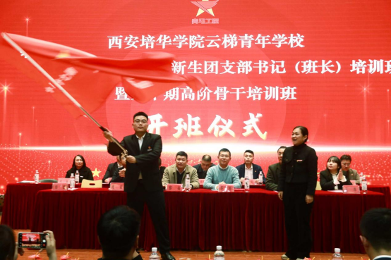 云梯青年学校校长、校团委书记杨媛为第十七期“青马工程”团支部书记(班长)培训班暨第十期高阶骨干培训班团建学长黄家驹授旗。
