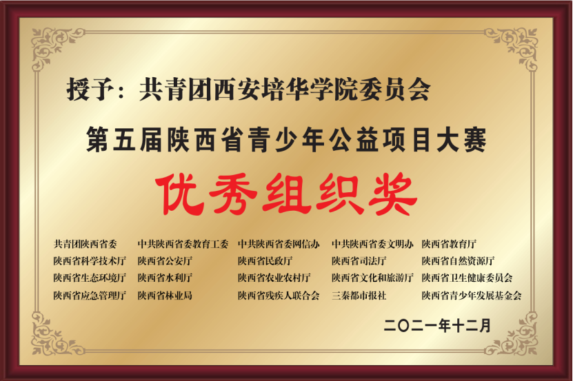 近日,第五届陕西省青少年公益项目大赛比赛结果揭晓。根据陕团联发《共青团陕西省委陕西省委教育工委 陕西省委网信办等关于第五届陕西省青少年公益项目大赛获奖情况的通报》,由学校推荐的《材优乡创——扎实培育学子,稳推“吴堡就业”》《以青春之名,陪你健康成长》荣获银奖,《博爱三秦,“救”在“益”起》《与你同行,守护未来》荣获铜奖,学校团委荣获本届大赛优秀组织奖。