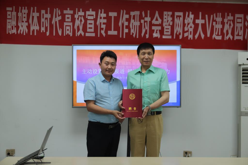 6月9日晚,陕西日报摄影记者高利受邀来到我校,为学校信息工作者及对摄影有兴趣的同学作题为《主动设置议题报道,提高舆论引导能力》的专题讲座。西安培华学院党委宣传部部长柳雨以及30余名师生聆听了此次讲座。高利老师受聘为西安培华学院大学生网络文化工作室指导教师,宣传部部长柳雨为高利老师颁发聘书。