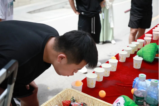 呐喊中齐头并进,第一个游戏是旱地龙舟,选手们以学院组队,十人组队、共同配合,声声呐喊中,游园会的气氛推向了高潮。