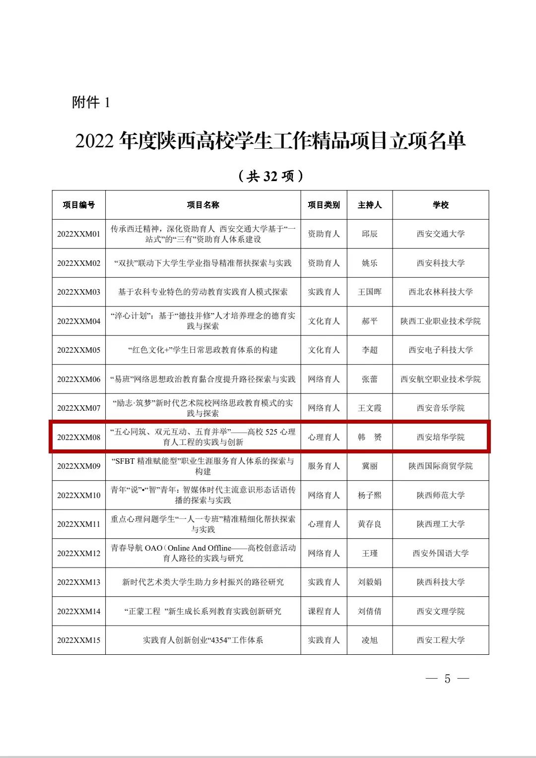 近日,中共陕西省委教育工委发布了《关于公布2022年度陕西高校学生工作精品项目和研究课题立项名单的通知》,我校潜能发展中心主任韩赟主持的《“五心同筑、双元互动、五育并举”——高校525心理育人工程的实践与创新》获批学生工作精品项目立项,会计与金融学院辅导员王思思主持的《退役复学大学生再融入心理及行为转型策略研究》获批学生工作研究课题立项。