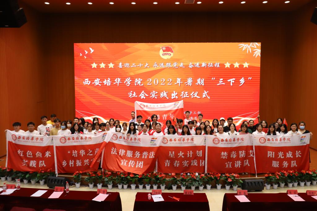 出征仪式现场展播了2021年西安培华学院社会实践“三下乡”《一路生花,青春绽放》;校团委杨媛老师宣读《关于成立西安培华学院2022年度暑期“三下乡”社会实践团队的通知》;参会嘉宾分别为2022校级重点立项团队、2022校级重点立项团队、2022校级重点立项团队授旗。