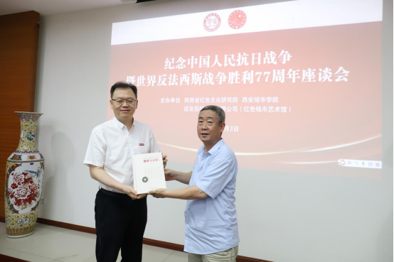 9月3日下午,由陕西省红色文化研究院、西安培华学院、延安百融展览有限公司(红色钱币艺术馆)联合主办的纪念中国人民抗日战争暨世界反法西斯战争胜利77周年座谈会在西安培华学院举行。来自全国从事红色文化研究、金融工作的专家学者、革命后人及培华学院教师齐聚一堂,开展纪念活动。活动由西安文理学院艺术学院数字媒体艺术系主任、延安红色钱币艺术馆副馆长东瑞主持。